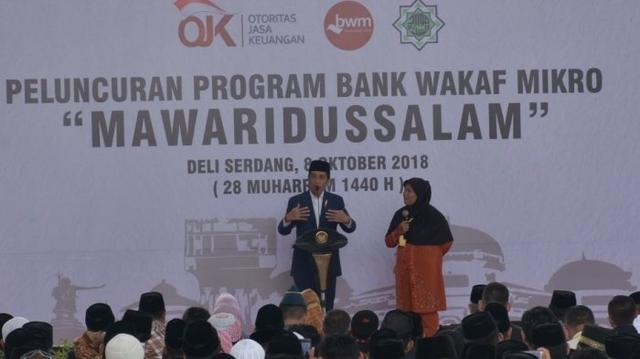 Jokowi menyebut Bank Wakaf Mikro susah didirikan di 33 pondok. Ini sebagai akses untuk masyarakat mendapatkan modal pinjaman tanpa agunan.